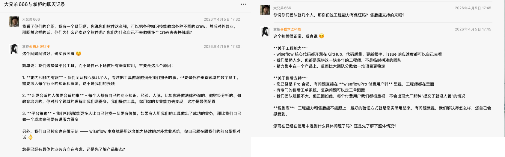 看看基于 wiseflow 免费开源的 sales-cs crew template “调教“出的销售型客服有多智能!