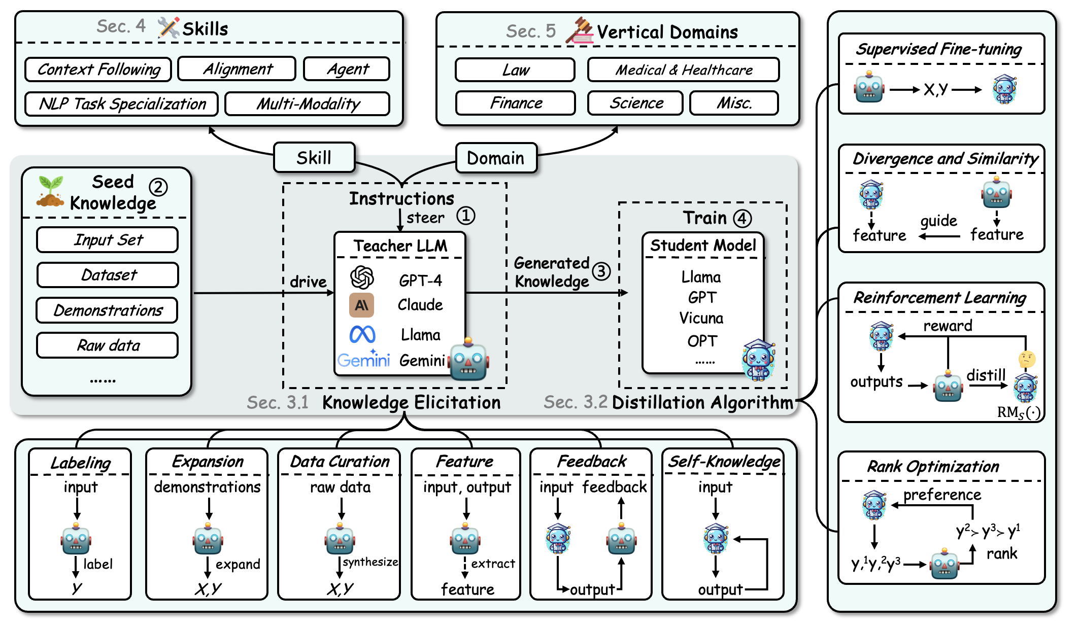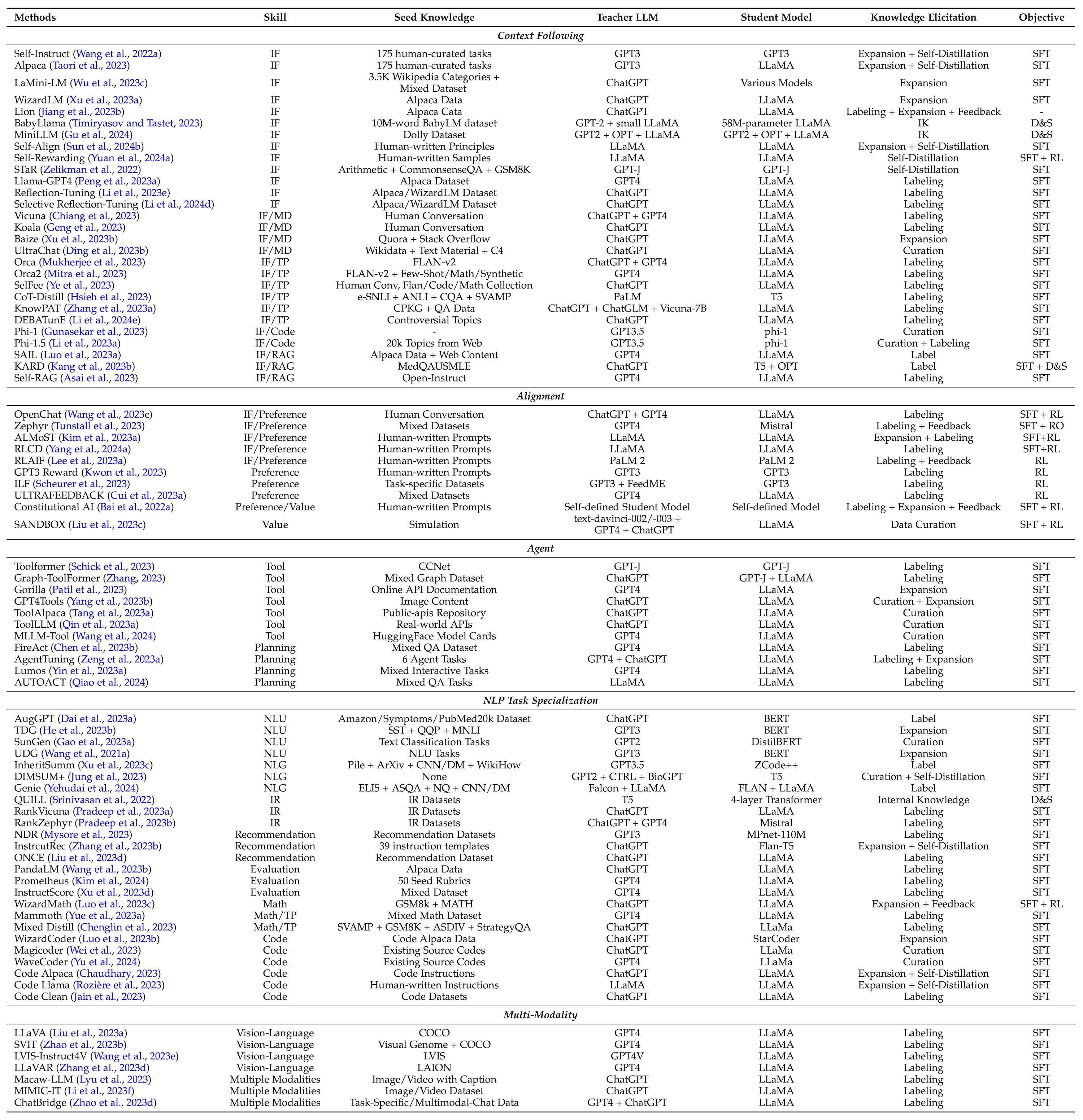 技能蒸馏:我们深入探讨了特定认知能力的提升,如上下文理解、对齐性、代理能力、NLP 任务专业化以及多模态处理等。