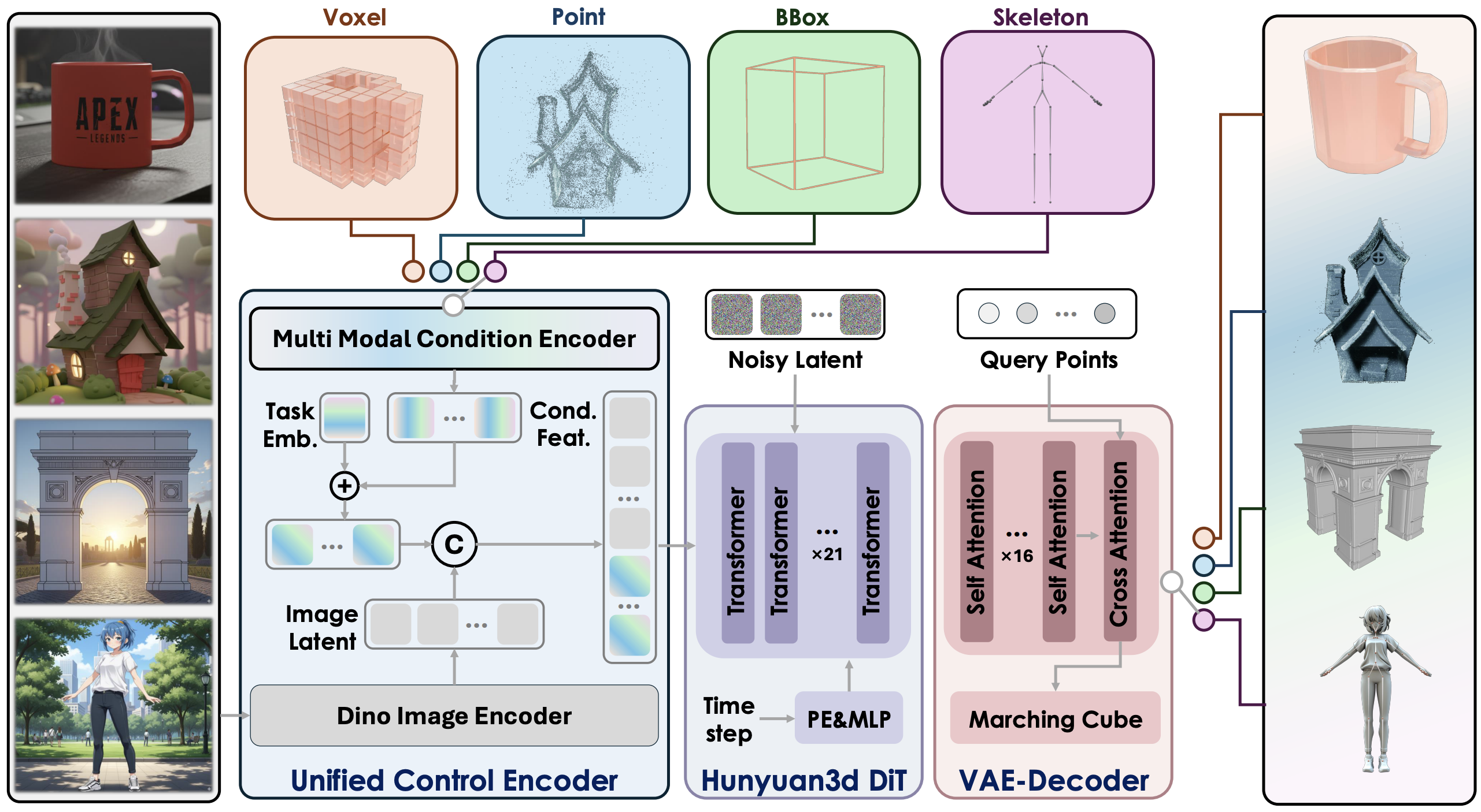 Hunyuan3D-Omni 是一个用于可控生成 3D 资产的统一框架,继承了 Hunyuan3D 2.1 的结构。与之不同的是,Hunyuan3D-Omni 构建了一个统一的控制编码器,以引入额外的控制信号,包括点云、体素、骨骼和边界框。