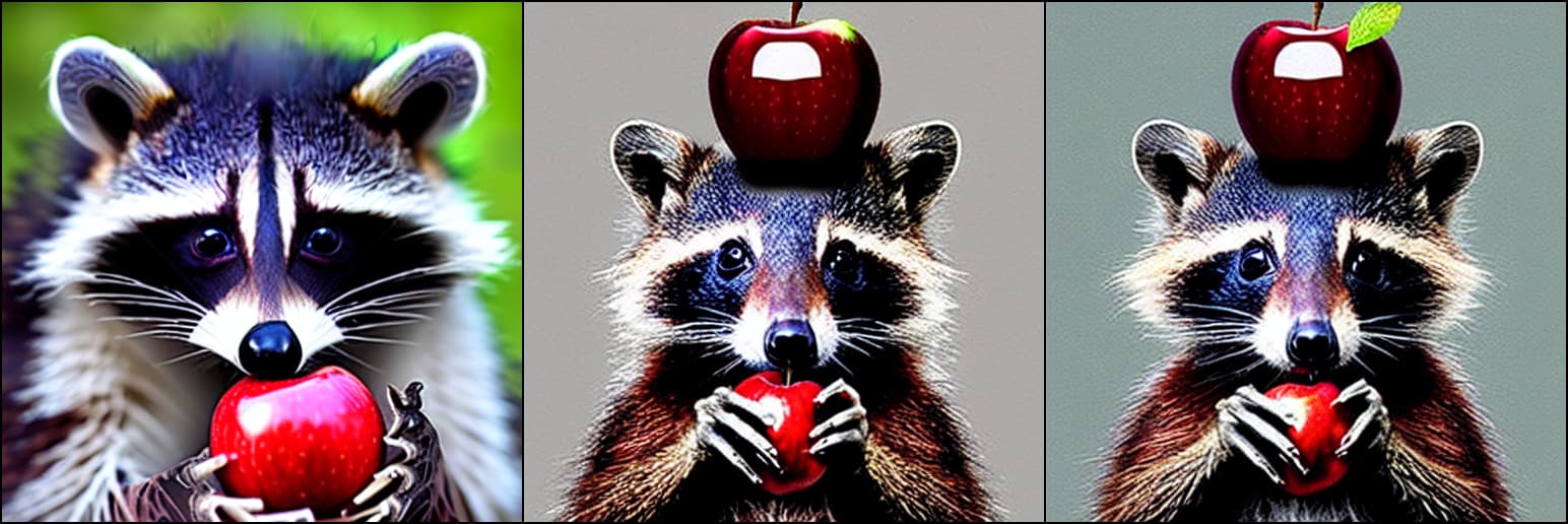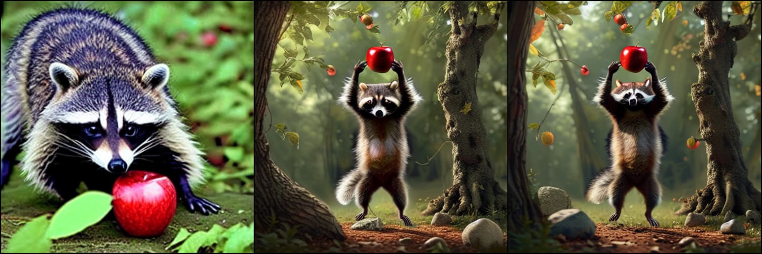 原始提示词:一只浣熊高举着一颗闪亮的红苹果