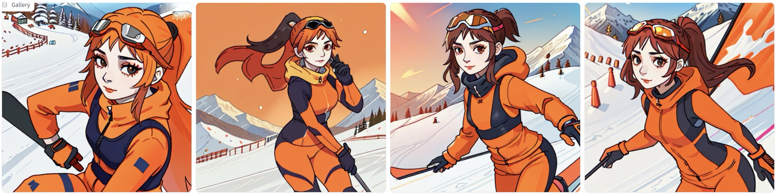 | 一位女士正穿着亮橙色滑雪服和护目镜,在雪山上滑雪。 | ![]() |