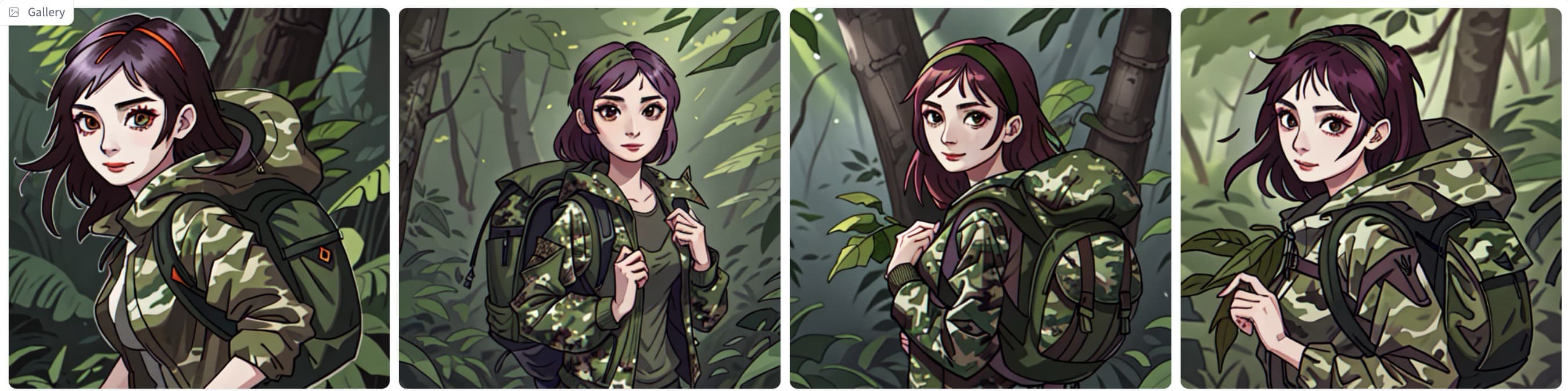 | 一位女士穿着绿色迷彩夹克,背着背包,在茂密的森林中徒步旅行。 | ![]() |