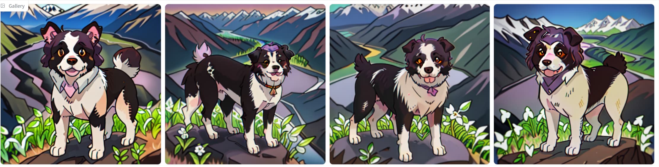 | 一只狗站在山顶上,俯瞰壮丽的景色。远处是白雪皑皑的山峰,山谷间有一条蜿蜒的河流。 | ![]() |