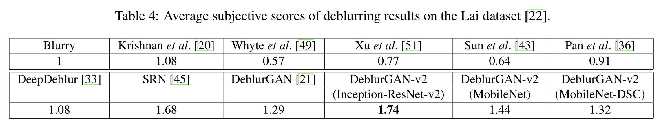 我们提出了一种用于单张图像运动模糊去除的新型端到端生成对抗网络(GAN),名为 DeblurGAN-v2,它显著提升了当前最先进的去模糊效率、质量和灵活性。DeblurGAN-v2 基于相对论条件 GAN,并采用双尺度判别器。我们首次将特征金字塔网络引入去模糊任务中,作为 DeblurGAN-v2 生成器的核心组件。该网络能够灵活地与多种骨干网络配合使用,从而在性能和效率之间取得平衡。通过集成强大的骨干网络(如 Inception-ResNet-v2),DeblurGAN-v2 可以达到最先进的去模糊效果;而当使用轻量级骨干网络(如 MobileNet 及其变体)时,DeblurGAN-v2 的速度比最接近的竞争对手快 10 到 100 倍,同时保持接近最先进水平的结果,这意味着其实时视频去模糊成为可能。我们在多个流行基准测试上展示了 DeblurGAN-v2 在去模糊质量(包括客观和主观评价)以及效率方面的卓越表现。此外,我们还证明了该架构在通用图像修复任务中同样有效。