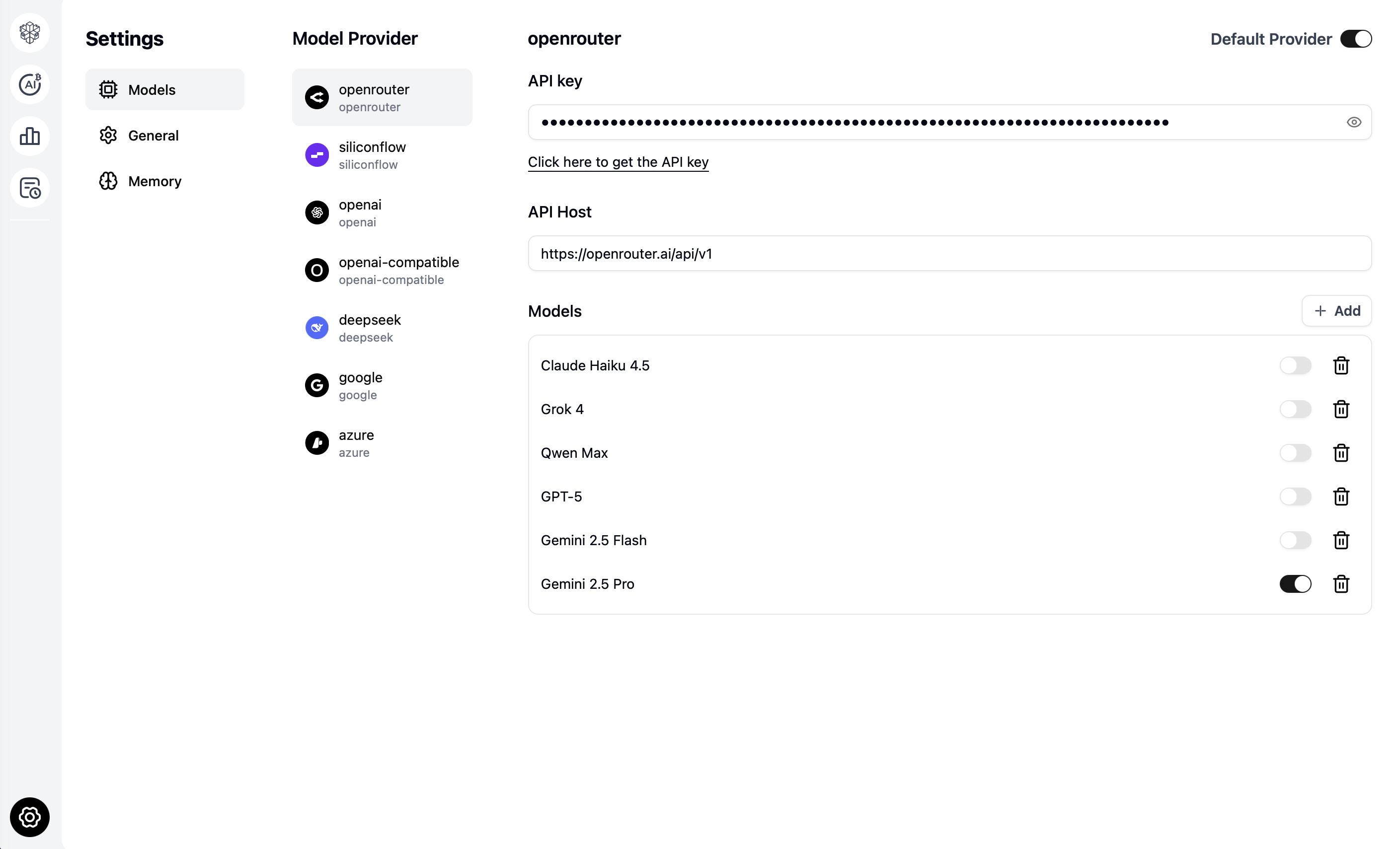 - 多种LLM提供商:支持 OpenRouter、SiliconFlow、Azure、OpenAI兼容、Google、OpenAI 和 DeepSeek