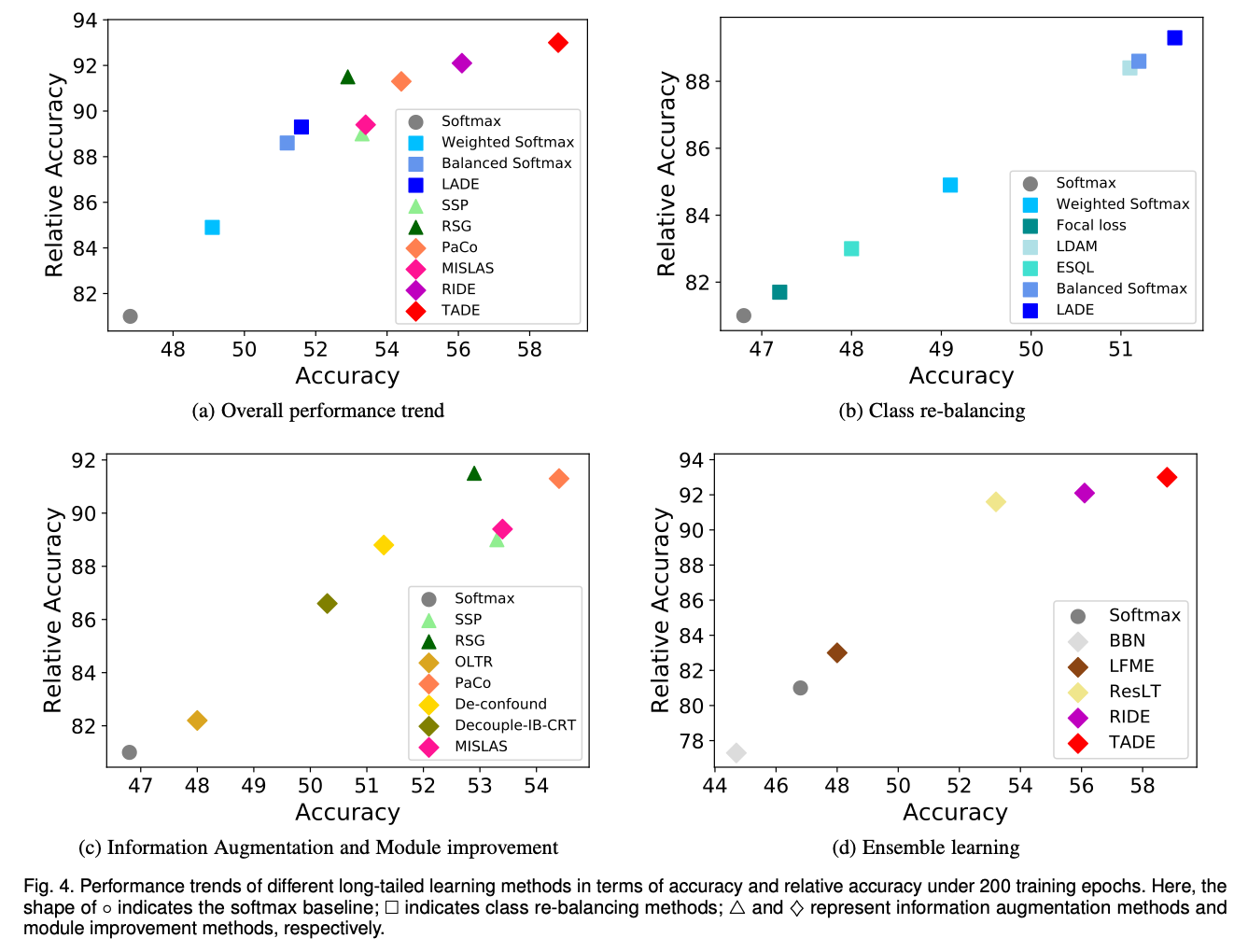 - 尽管一些近期高精度的方法RA较低,但从下图可以看出,长尾学习的整体发展趋势仍然是积极的。