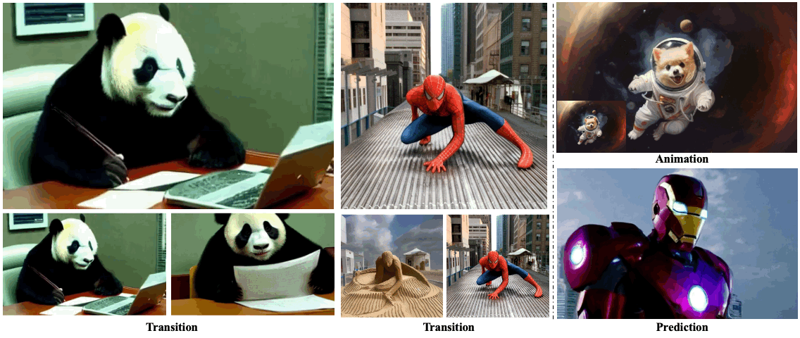 SEINE 是一款专为视频生成设计的开源扩散模型,核心能力在于将静态图片或简短片段转化为流畅的长视频。它主要解决了当前 AI 视频生成中常见的画面不连贯、动作生硬以及难以从单张图片预测后续动态等难题。通过独特的“短至长”(Short-to-Long)建模策略,SEINE 不仅能实现高质量的图生视频(I2V),让静止画面根据文字描述自然动起来,还能在两张给定的关键帧之间生成平滑自然的过渡动画,填补中间缺失的动作细节。