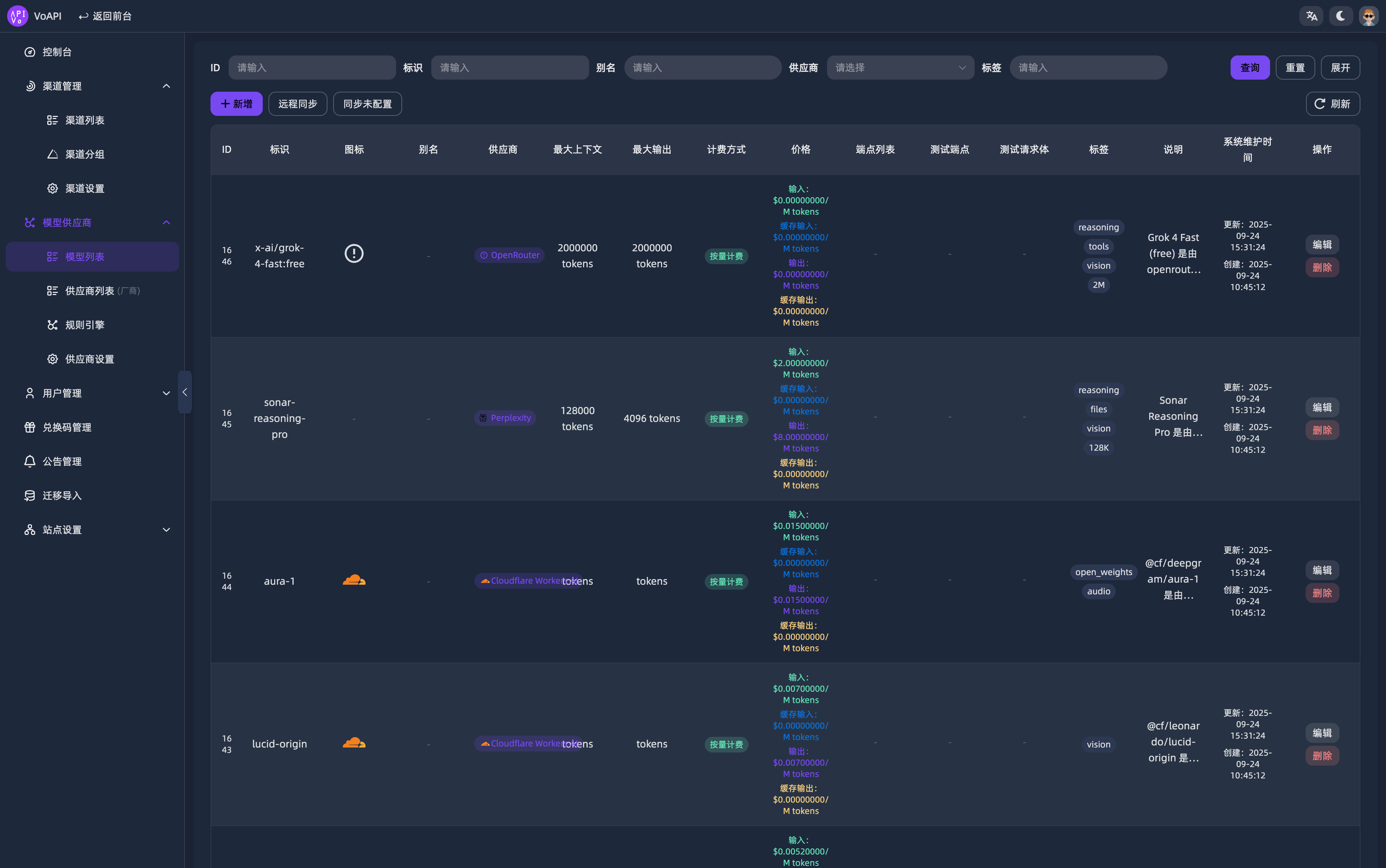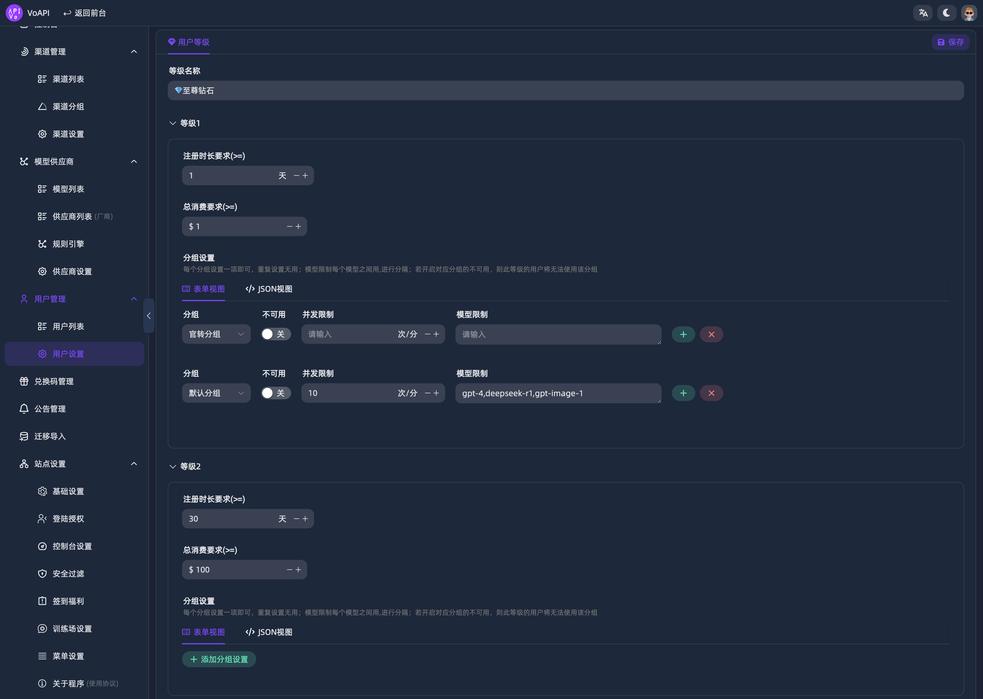 - 一键聚合分发:通过 VoAPI 的远程同步功能,分钟级接入数十种主流模型;利用规则引擎和渠道分组,实现请求的自动负载均衡与故障转移。