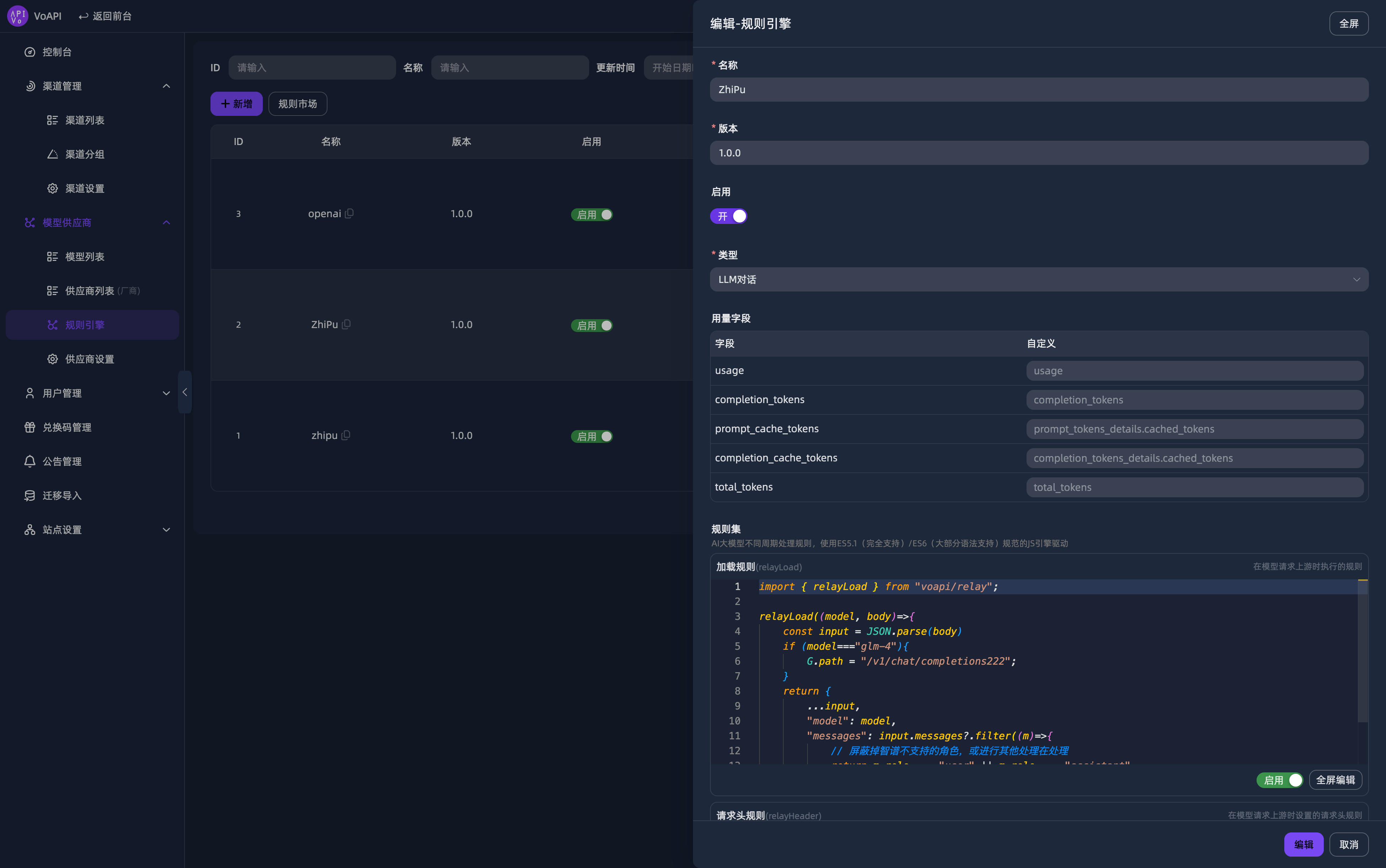 - 然后到「模型供应商」模块下的「规则引擎」新建一个空白规则引擎,名称随意,非必填内容无需填写,则为完全透传