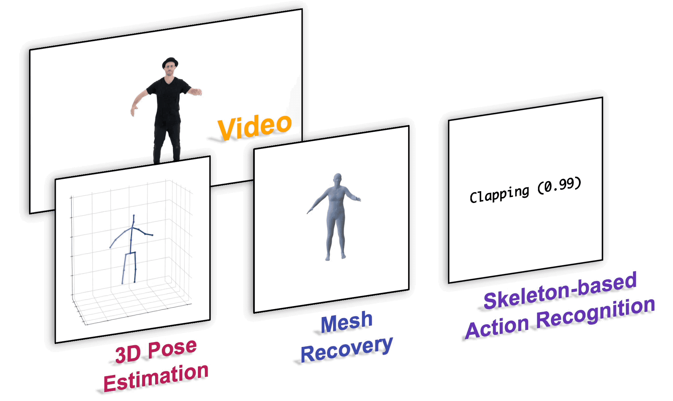model_action.py),几天内即可完成从姿态估计到动作识别的任务切换。 - 精准 3D 重建:利用其先进的时序建模机制,能从单目 2D 关键点中高效恢复出平滑、准确的 3D 人体网格与骨骼,精确计算关节角度。