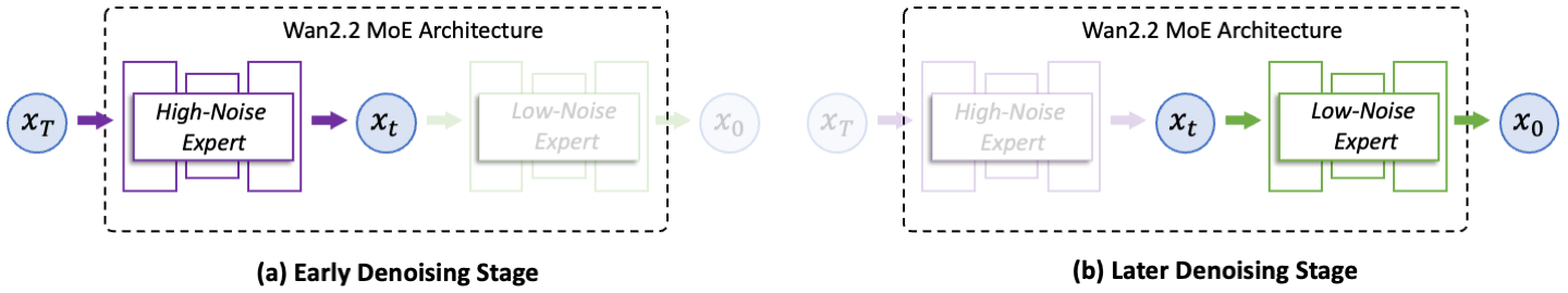 Wan2.2 将混合专家(MoE)架构引入了视频生成扩散模型。MoE 在大型语言模型中已被广泛验证,是一种在保持推理成本几乎不变的同时有效提升模型总参数量的方法。在 Wan2.2 中,A14B 系列模型采用了专为扩散模型去噪过程量身定制的双专家设计:早期阶段使用高噪声专家,侧重于整体布局;后期阶段则切换为低噪声专家,专注于细化视频细节。每个专家模型约有 140 亿参数,因此总参数量达到 270 亿,但每一步仅激活 140 亿个参数,从而将推理计算量和 GPU 显存占用基本维持在原有水平。