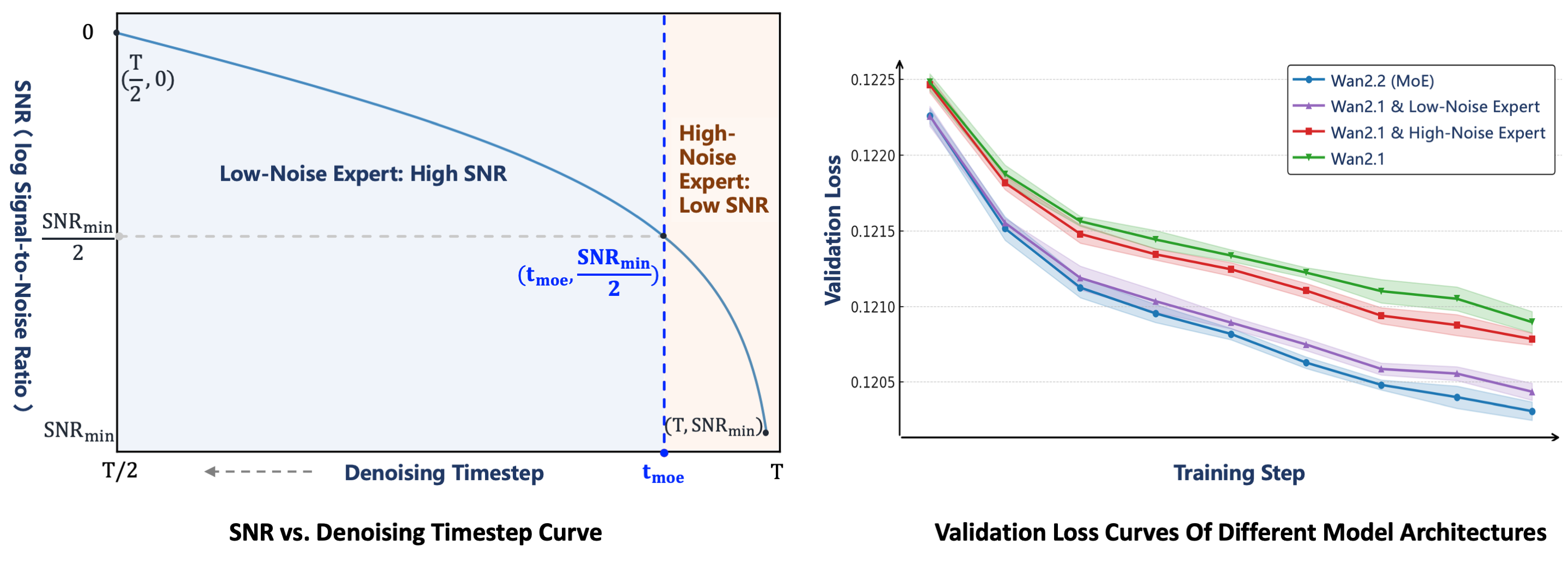 为了验证 MoE 架构的有效性,我们基于其验证损失曲线对比了四种设置。基准模型 Wan2.1 并未采用 MoE 架构。在基于 MoE 的变体中,Wan2.1 & 高噪声专家 以 Wan2.1 模型作为低噪声专家,同时使用 Wan2.2 的高噪声专家;而 Wan2.1 & 低噪声专家 则以 Wan2.1 作为高噪声专家,并采用 Wan2.2 的低噪声专家。最终版本 Wan2.2 (MoE) 的验证损失最低,表明其生成的视频分布最接近真实数据,且具有更优的收敛性能。