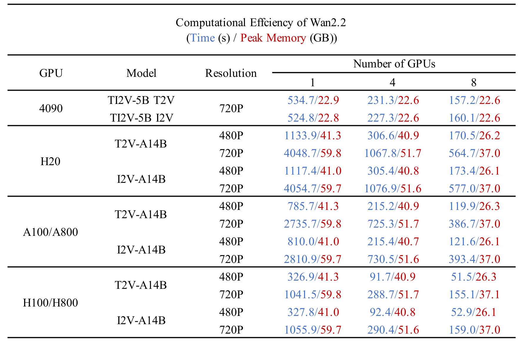 我们在下表中测试了不同 Wan2.2 模型在不同GPU上的计算效率。结果以 总时间(秒)/ GPU峰值显存(GB) 的形式呈现。