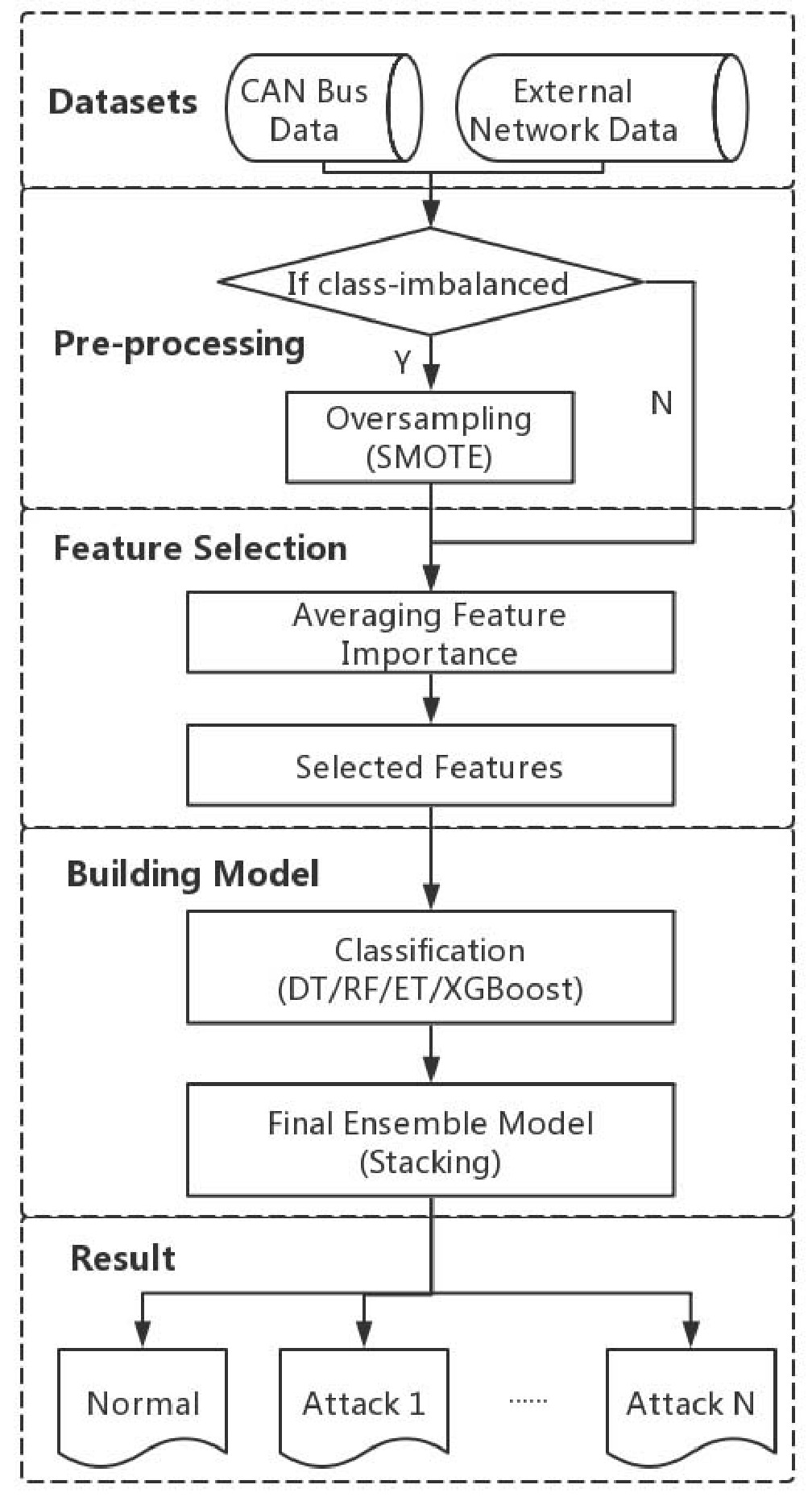 现代车辆,包括联网汽车和自动驾驶汽车,通常配备多个电子控制单元,并通过车载网络连接以实现各种功能和操作。同时,现代车辆还通过V2X技术接入外部网络,从而与其他车辆、基础设施和智能设备进行通信。然而,随着车辆功能和连通性的不断增强,其针对车载网络和外部网络的攻击面也在扩大,使其更容易受到网络攻击。为保障车载网络的安全,许多研究人员致力于开发基于机器学习的入侵检测系统(IDS),以识别恶意网络攻击。本文探讨了车载网络和外部网络的脆弱性,并提出了一种多层混合IDS,结合签名检测和异常检测两种机制,以同时检测已知和未知的网络攻击。实验结果表明,该系统能够准确检测代表车载网络数据的CAN-Intrusion数据集以及反映外部车联网数据的CICIDS2017数据集中存在的各类已知攻击。 所提出的MTH-IDS框架由两个传统的机器学习阶段(数据预处理和特征工程)以及四个层次的学习模型组成:
