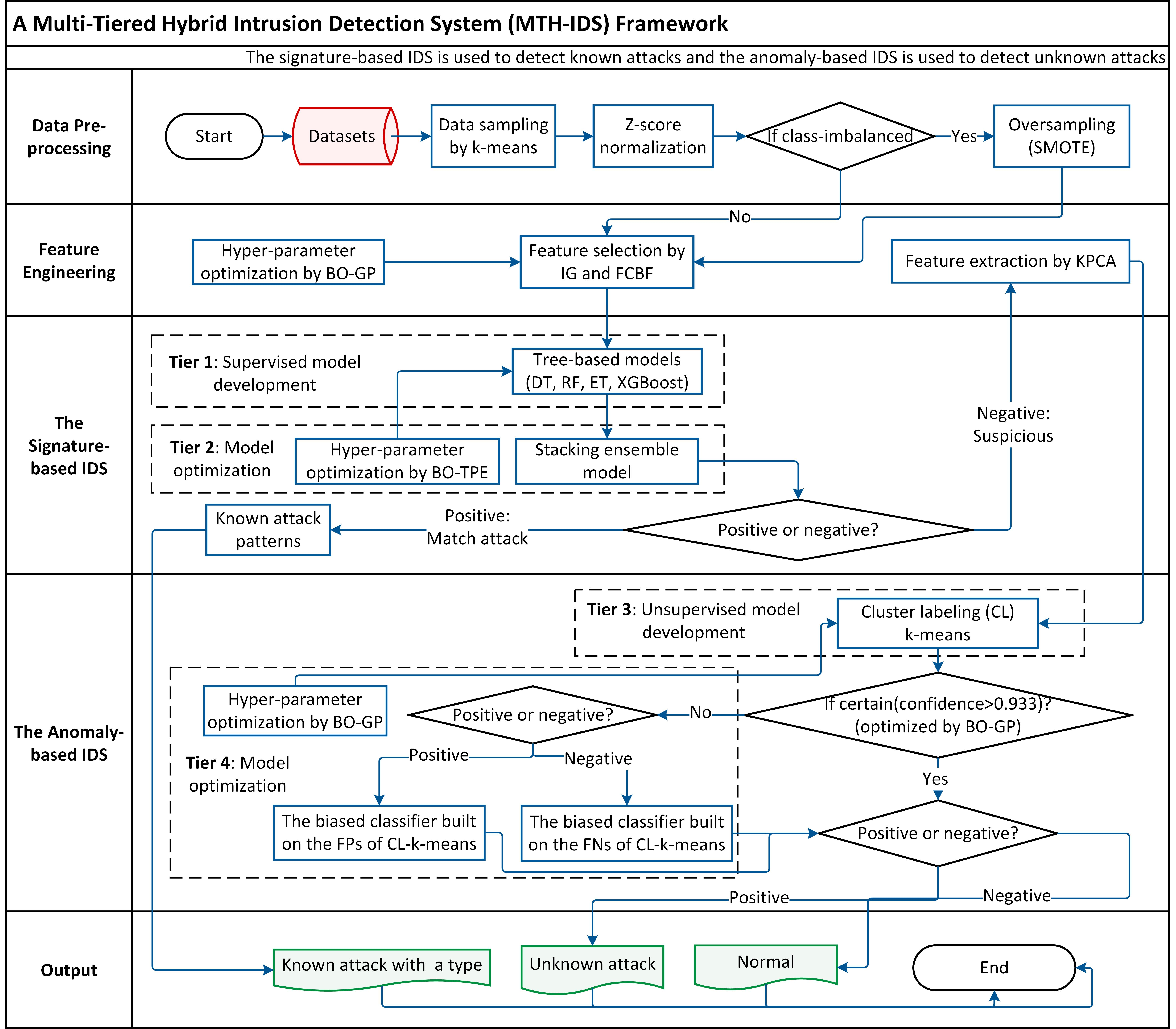 本仓库通过实现多种机器学习算法,提出了三种入侵检测系统,包括基于树的算法(决策树、随机森林、XGBoost、LightGBM、CatBoost等)、无监督学习算法(k-means)、集成学习算法(堆叠、提出的LCCDE)以及超参数优化技术(贝叶斯优化)。