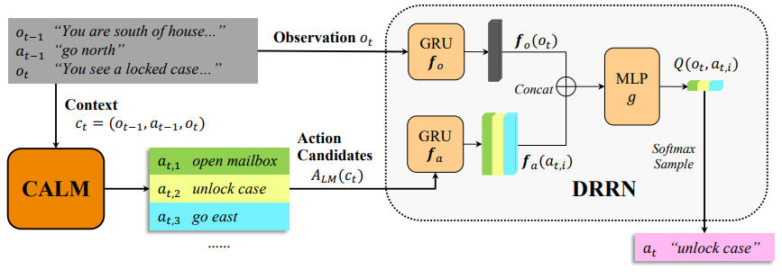 CALM 与一个强化学习智能体——DDRN——结合用于游戏玩法。CALM 基于人类游戏的转录本进行训练,以生成动作。在每个状态下,CALM 会根据游戏上下文生成候选动作,而 DRRN 则计算这些动作的 Q 值,从而选择最终的动作。一旦训练完成,单个 CALM 实例即可用于为任何文本类游戏生成动作。