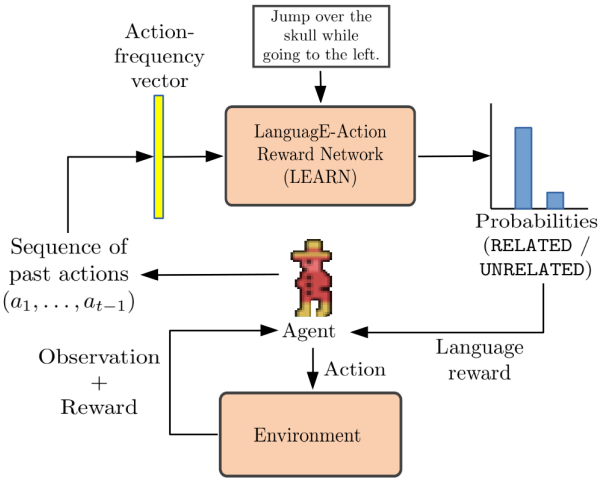 本文提出了一种利用自然语言提供奖励的方法。当时还没有大型语言模型,因此作者使用了大量的现有游戏视频及其对应的语言描述作为数据集。他们训练了一个前馈神经网络(FNN),该网络可以输出当前轨迹与语言指令之间的关系,并将这一输出作为中间奖励。通过将其与原始稀疏的环境奖励相结合,强化学习智能体能够基于目标和语言指令更快地学习到最优策略。