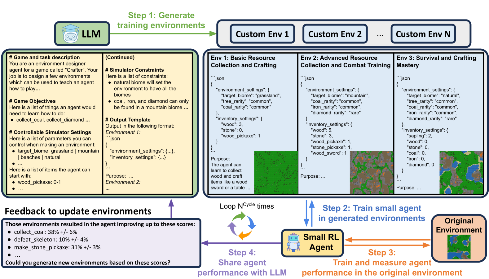 在EnvGen框架中,作者使用大型语言模型生成多种环境,使智能体能够有效学习不同技能。整个训练过程分为N个循环,每个循环包含以下四个步骤。