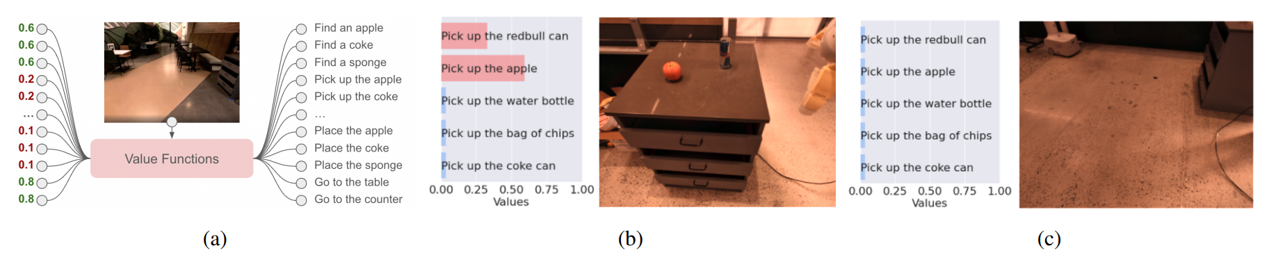 会查询一个价值函数模块 (a),根据当前观测结果构建动作基元的价值函数空间。以“pick”价值函数为例,在 (b) 场景中,“拿起红色的公牛罐头”和“拿起苹果”的值较高,因为这两个物体都在场景中;而在 (c) 场景中,机器人正在空旷的空间中导航,因此没有任何拿起动作能获得高值。