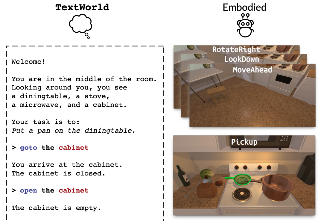 ALFWorld 包含交互式的TextWorld环境(Côté等),这些环境与ALFRED数据集中体现的身体化世界相对应(Shridhar等)。这些对齐的环境允许智能体在抽象空间中进行推理并学习高层策略,然后再通过低层执行来解决具体的任务。