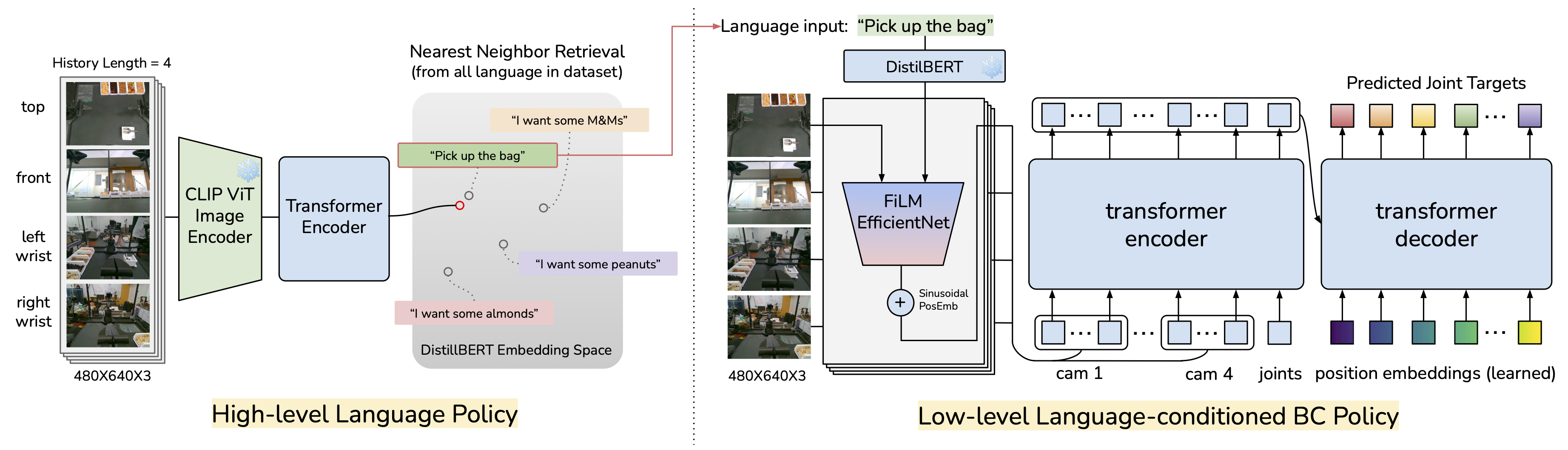系统以RGB图像和机器人当前的关节位置作为输入,输出用于电机动作的目标关节位置。高层策略使用视觉Transformer对视觉输入进行编码,并预测语言嵌入。低层策略则使用ACT——一种基于Transformer的模型——在语言指令的指导下生成精确的机器人动作。这种架构使机器人能够理解“拿起包”之类的指令,并将其转化为目标关节的动作。