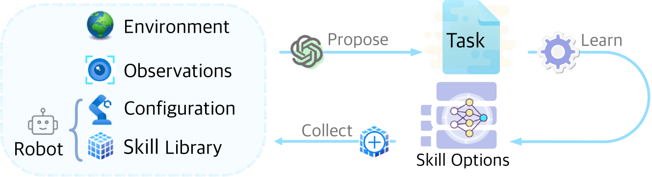 ASD的上下文技能获取循环。给定环境设置和机器人当前的能力,LLM会持续提议机器人需要完成的任务,成功完成后这些任务将被收集为已习得的技能,每项技能都有多个神经网络变体(选项)。