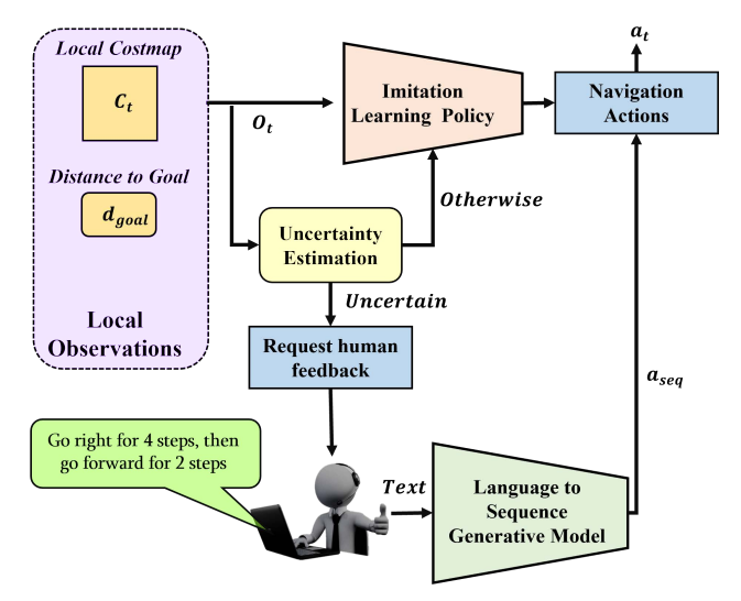 (b) 支持人类参与的框架,即人类监督机器人并提供反馈。