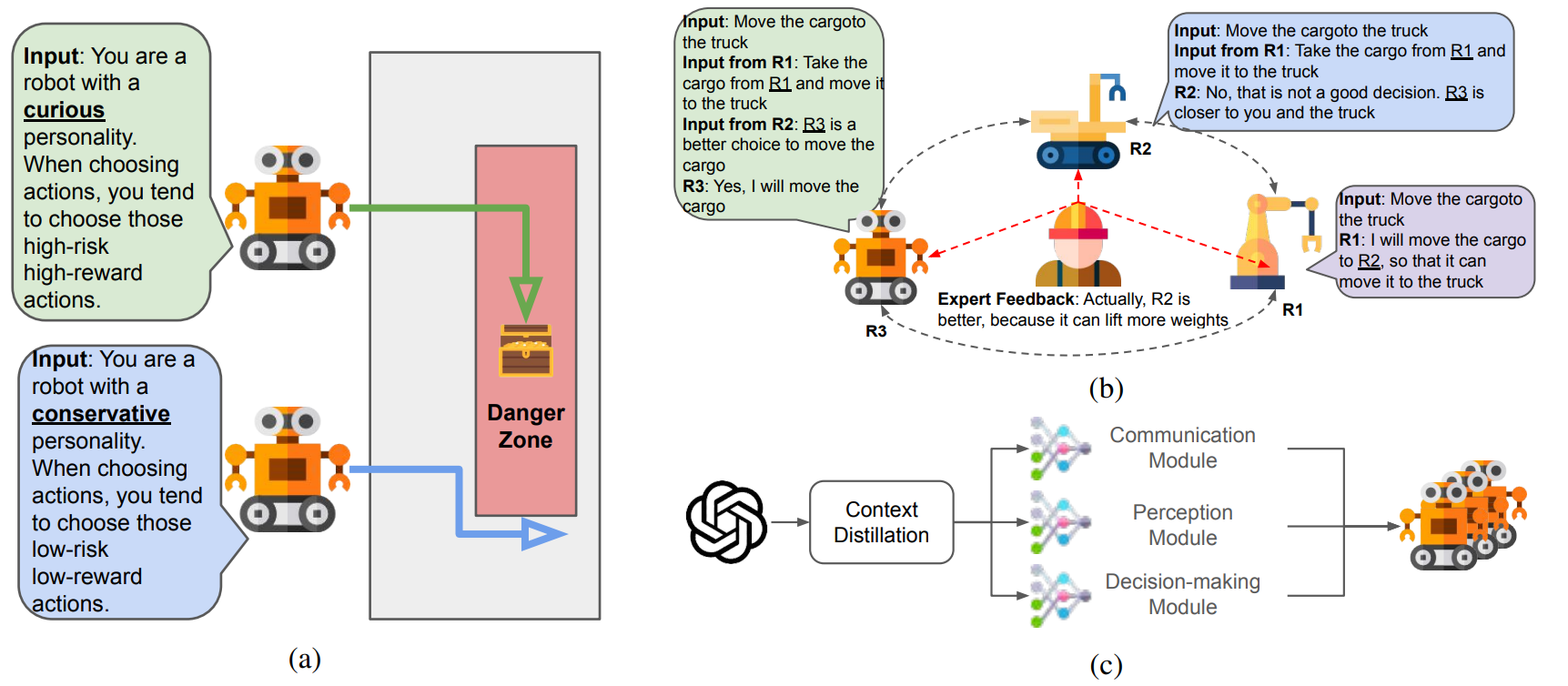 (a) 具有人格特征的合作,其中不同机器人由指令定义的不同人格进行协作。