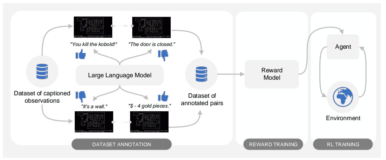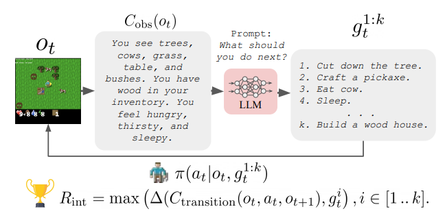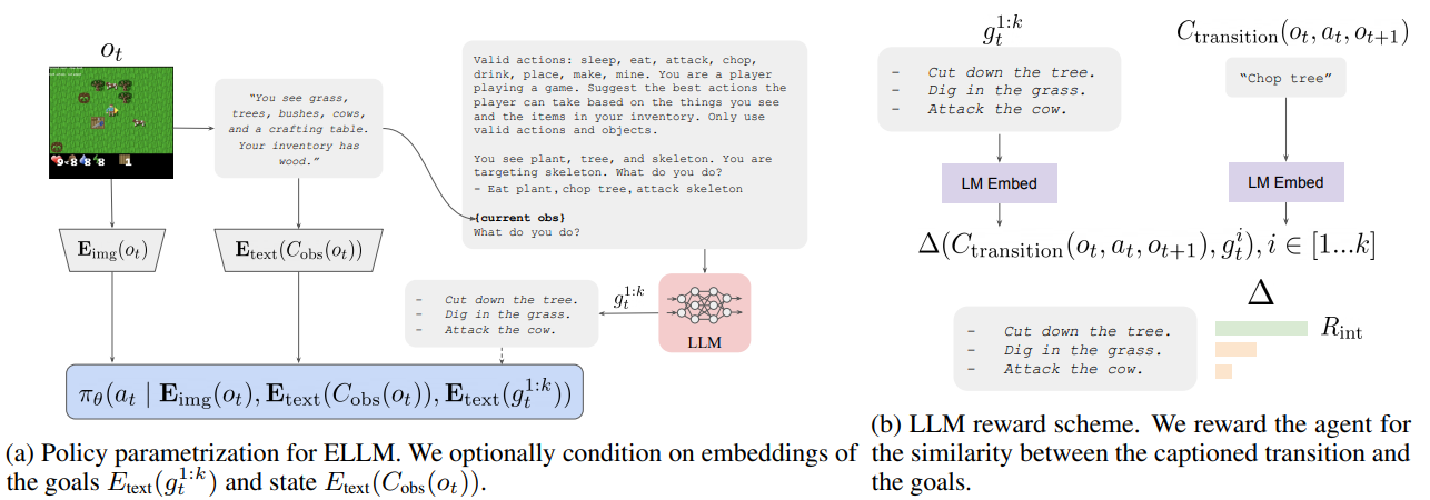 ELLM利用预训练的大规模语言模型(LLM),以一种与任务无关的方式建议可能有用的目标。基于LLM的上下文敏感性和常识能力,ELLM训练强化学习智能体去追求那些很可能有意义的目标,而无需直接的人工干预。