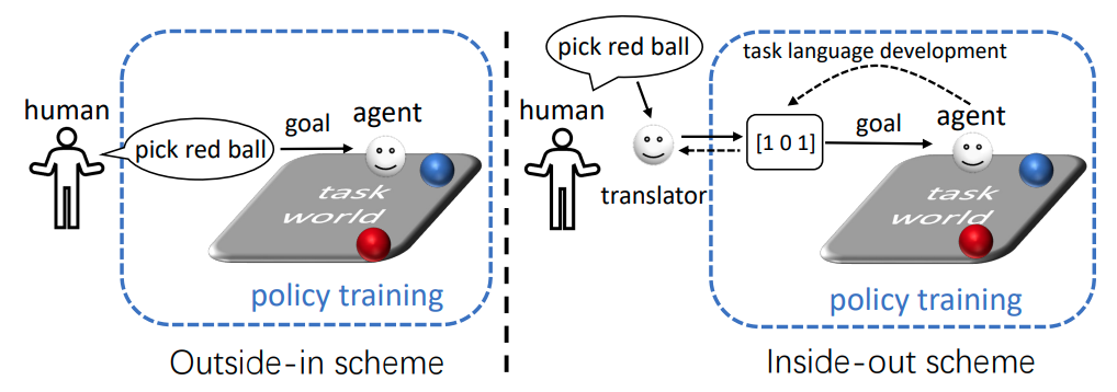 基于内部向外的任务语言开发与翻译的自然语言条件强化学习