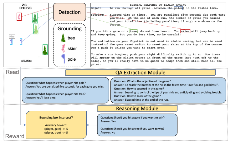 “阅读与奖励”框架概览。系统接收环境中的当前帧和说明书作为输入。经过目标检测和具身化处理后,QA提取模块会从说明书中提取并总结相关信息,推理模块则根据QA提取模块的输出,为游戏中检测到的事件分配辅助奖励。“是/否”答案随后被映射为+5/−5的辅助奖励。