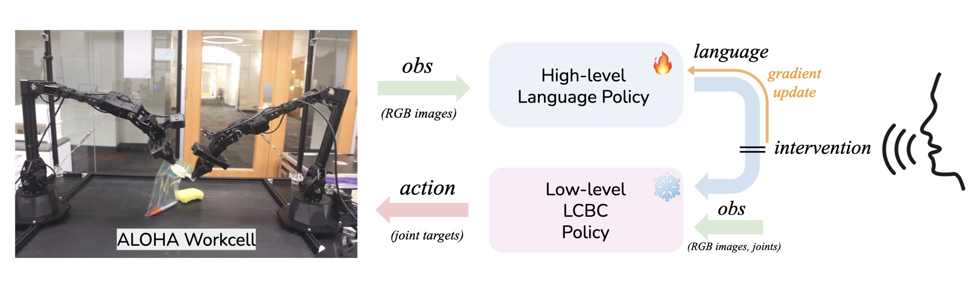 作者采用分层架构,高层策略生成语言指令,供低层策略执行相应的技能。部署过程中,人类可以通过纠正性语言命令进行干预,临时覆盖高层策略,直接影响低层策略以实现实时调整。这些干预随后会被用来微调高层策略,从而提升其未来的性能。