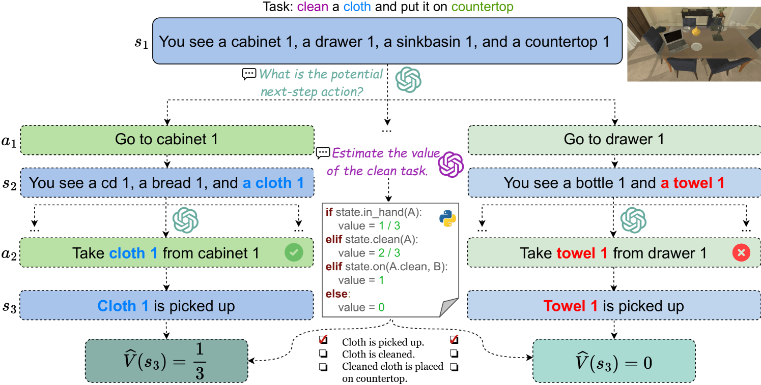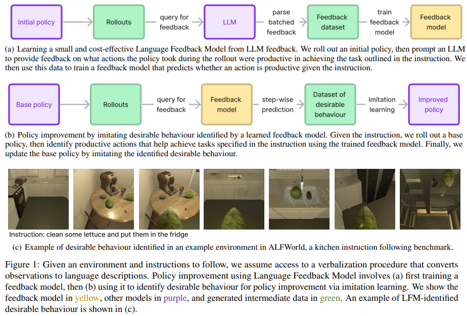 本文提出的框架简单明了,是早期将LLM用于强化学习策略的研究之一。在这个框架中,规划者是LLM,而报告者和执行者则是强化学习组件。任务要求先检查物品的属性,再选择具有“良好”属性的物品。框架从规划者开始,向其提供任务描述和历史执行记录。规划者随后为执行者选择一个行动。执行者执行动作后会得到结果。报告者观察环境并向规划者反馈,这一过程不断重复。