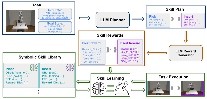 作者提出了一套利用LLM引导持续学习的框架。他们将LLM集成用于TAMP的任务分解和操作符创建,并为RL技能学习生成密集奖励,从而实现针对长时程任务的在线自主学习。同时,他们还使用语义技能库来提高新技能的学习效率。