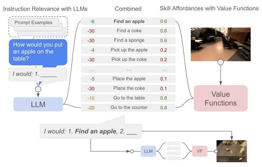 给定一个高层指令,SayCan 将来自 LLM 的概率(即某项技能对指令有用的概率)与来自价值函数的概率(即成功执行该技能的概率)相结合,以选择要执行的技能。这样生成的技能既可行又有效。随后,将该技能附加到响应中,并再次查询模型,这一过程不断重复,直到输出步骤为终止。
