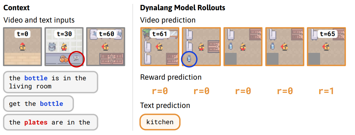 Dynalang 学习使用语言对未来(文本+图像)观测值和奖励进行预测,从而帮助其完成任务。在此,作者展示了在 HomeGrid 环境中的真实模型预测结果。智能体探索了多个房间,并从环境中获取视频和语言观测信息。根据过去的文本“瓶子在客厅里”,智能体在第 61 至 65 个时间步预测它将在客厅的最后一个角落看到瓶子。根据描述任务的文本“拿瓶子”,智能体预测自己会因拿起瓶子而获得奖励。此外,智能体还能预测未来的文本观测:给定前缀“盘子在”以及在第 30 个时间步观察到的台面上的盘子,模型预测最有可能出现的下一个词是“厨房”。