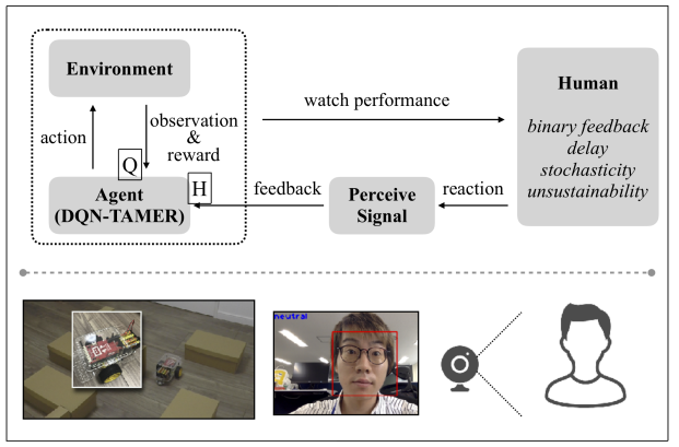 人机协作强化学习及模型(DQNTAMER)的概览。智能体在给定环境中与人类观察者异步交互。DQN-TAMER 根据两个模型来决定行动:一个模型(Q)用于估计来自环境的奖励,另一个模型(H)则用于获取来自人类的反馈。