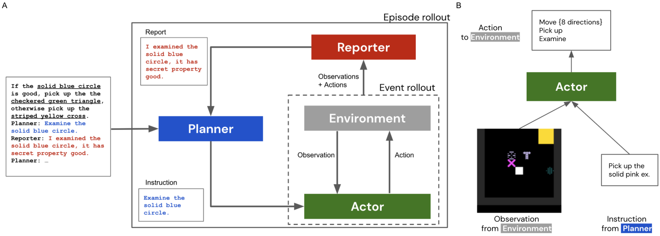 A. 规划者-执行者-报告者范式的示意图及三者之间交互的示例。B. PycoLab环境的观测空间和动作空间。