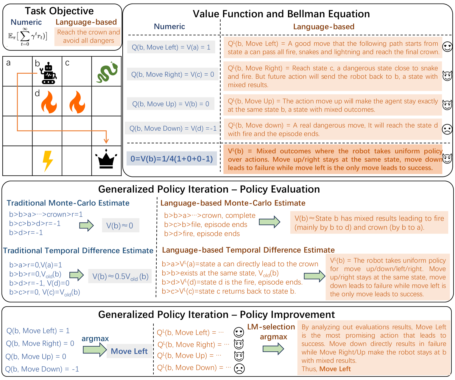 自然语言条件强化学习(NLC-RL)使智能体能够遵循人类指令。以往的方法通常通过提供自然语言指令并训练一个遵循策略来实现自然语言条件强化学习。在这种“外向式”方法中,策略需要同时理解自然语言并完成任务。然而,不受限制的自然语言示例往往会给具体的强化学习任务带来额外的复杂性,从而分散策略学习完成任务的注意力。为了减轻策略的学习负担,作者提出了一种“内向式”自然语言条件强化学习方案,开发了一种与任务相关且独特的任务语言(TL)。该任务语言用于强化学习中,以实现高效且有效的策略训练。此外,还训练了一个翻译器将自然语言翻译成任务语言。他们将这一方案实现为TALAR(带有谓词表示的任务语言),该模型学习多个谓词来建模对象关系作为任务语言。实验表明,TALAR不仅更好地理解了自然语言指令,还生成了更好的指令遵循策略,成功率达到13.4%,并且能够适应未见过的自然语言表达方式。此外,任务语言还可以作为一种有效的任务抽象,天然地与层次化强化学习兼容。