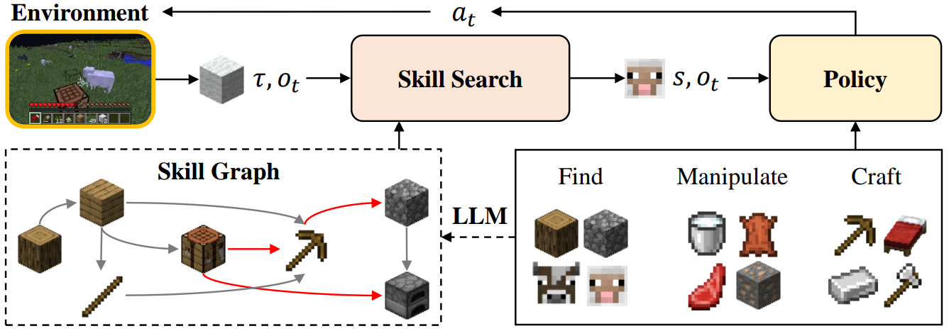 作者将 Minecraft 中的基本技能分为三类:发现技能、操作技能和制作技能。他们利用强化学习训练策略来掌握这些技能。借助 LLM,作者提前提取技能之间的关系并构建技能图,如虚线框所示。在线规划时,技能搜索算法会在预生成的图上遍历,将任务分解为可执行的技能序列,并交互式地选择相应的策略来解决复杂任务。