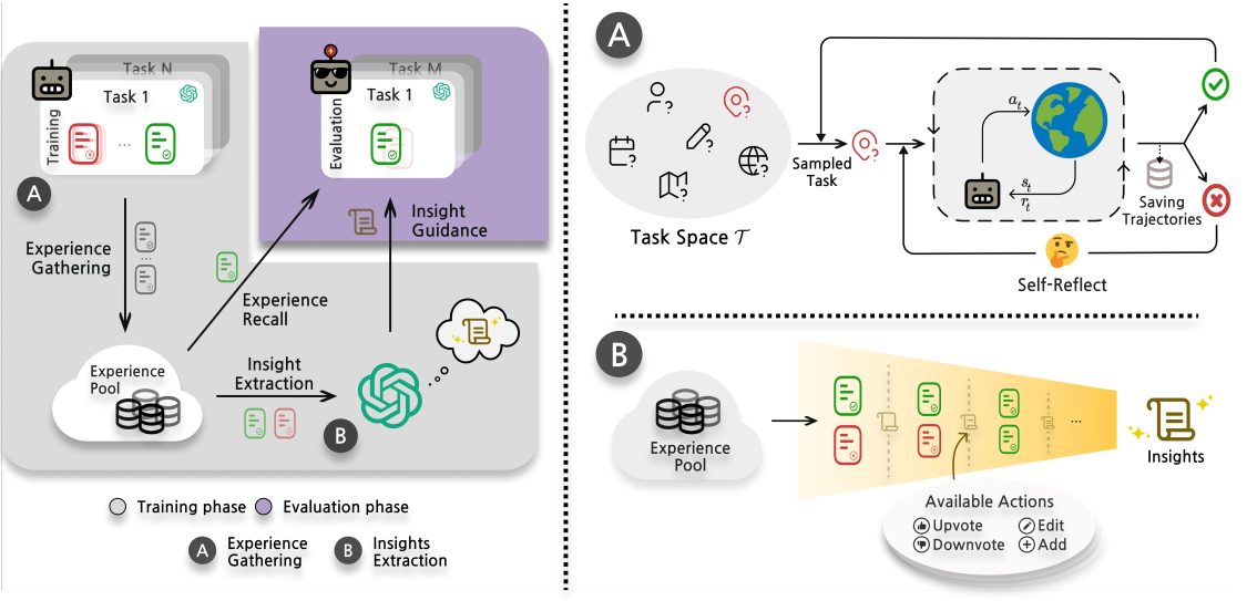 左图:ExpeL 分为三个阶段:(1) 将成功和失败的经验收集到池中。 (2) 从这些经验中提取/抽象出跨任务的知识。 (3) 在评估任务中应用所获得的洞见,并回忆过去的成功经验。 右图:(A) 展示了通过反思进行经验收集的过程,使智能体在对失败进行自我反思后能够重新尝试任务。(B) 展示了洞见提取步骤。当面对成功/失败配对或 L 个成功案例列表时,智能体可以使用 ADD、UPVOTE、DOWNVOTE 和 EDIT 等操作动态修改现有的洞见列表。这一过程的重点在于提取常见的失败模式或最佳实践。