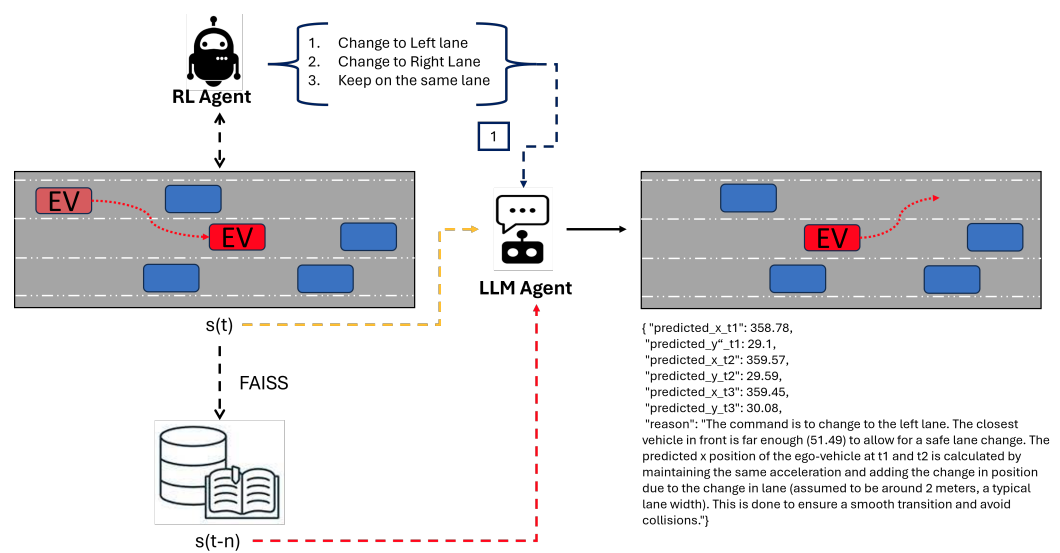 基于LLM的车辆轨迹规划结构:RL智能体观察交通状况(周围车辆),并给出一个换道的高层动作。随后,LLM智能体通过FAISS检索highD数据集,并提供接下来的三个轨迹点。