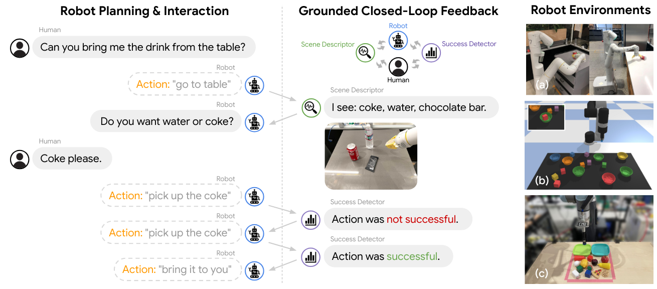 内心独白通过结合一系列感知模型(如场景描述符和成功检测器)与预训练的语言条件机器人技能,为基于大型语言模型的机器人规划提供 grounded 的闭环反馈。实验表明,该系统能够在模拟和真实环境中,针对 (a) 移动操作和 (b,c) 桌面操作等复杂长 horizon 任务进行推理和重规划,从而完成目标。