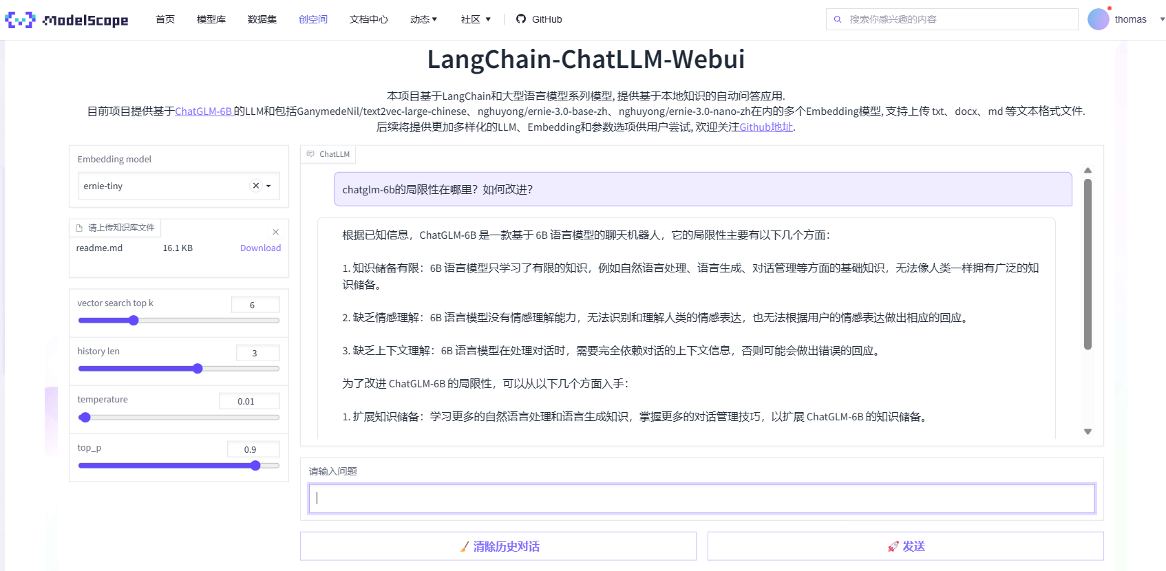 该工具适合开发者、研究人员以及对 AI 应用感兴趣的普通用户使用,尤其适合希望在本地部署、保护数据隐私的前提下实现智能问答场景的人群。项目支持多种主流中文大模型和嵌入(Embedding)模型,并提供图形化 Web 界面,降低了使用门槛。同时,它已在 HuggingFace、ModelScope、OpenXLab 等多个平台上线在线体验版本,方便用户快速试用和部署。
