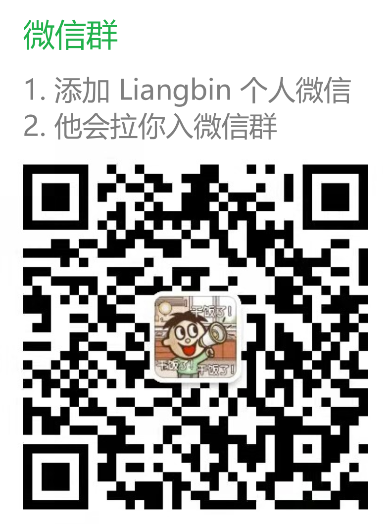- 微信群: 我们的一群已满500人,二群也超过200人;进群可添加Liangbin的个人微信(右侧二维码),他会在空闲时将大家拉入群~