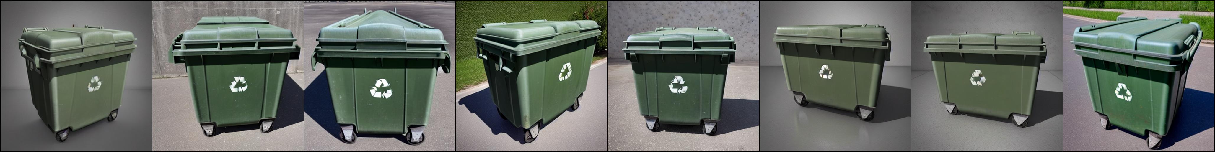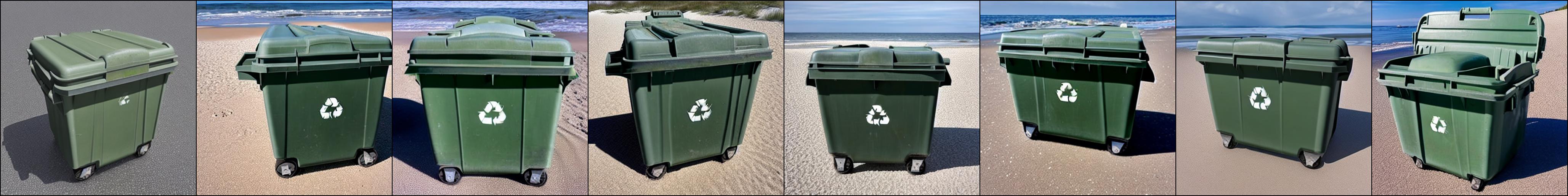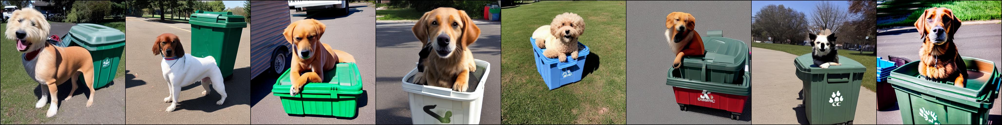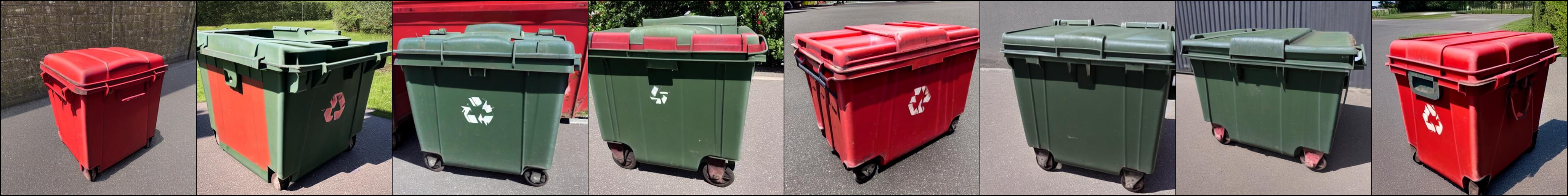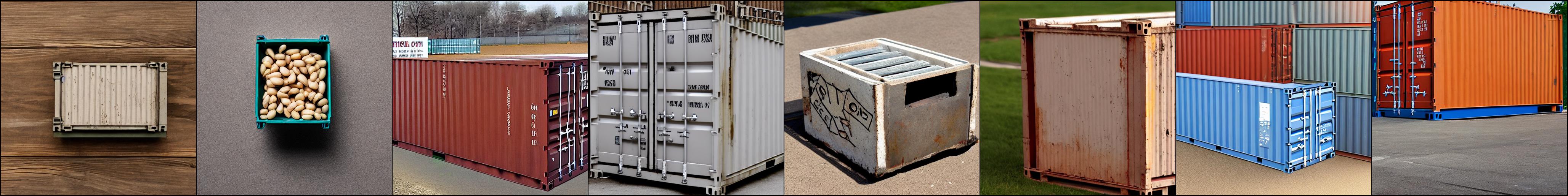 这里展示一些定性结果。训练图像取自 Textual Inversion 仓库中的 issue,分别是三个大型垃圾箱的图片。正则化图像由提示词 photo of a container 生成。正则化图像如下: