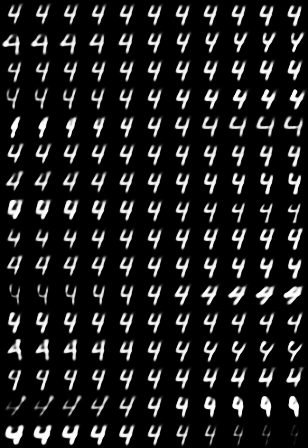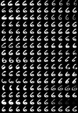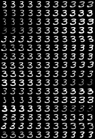 对于每个数字,第i行对应胶囊的第i维,从左到右的列则表示向胶囊某一维的值依次添加[-0.25, -0.2, -0.15, -0.1, -0.05, 0, 0.05, 0.1, 0.15, 0.2, 0.25]。
