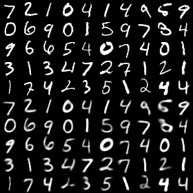 顶部5行是MNIST的真实图像,底部则是对应的重构图像。