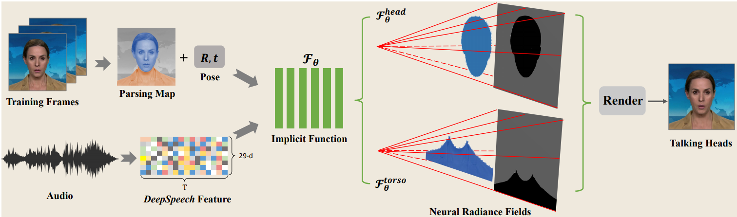 我们使用 face-parsing.PyTorch 来解析头部和躯干图,并使用 DeepSpeech 进行音频特征提取。NeRF 模型是基于 NeRF-pytorch 实现的。