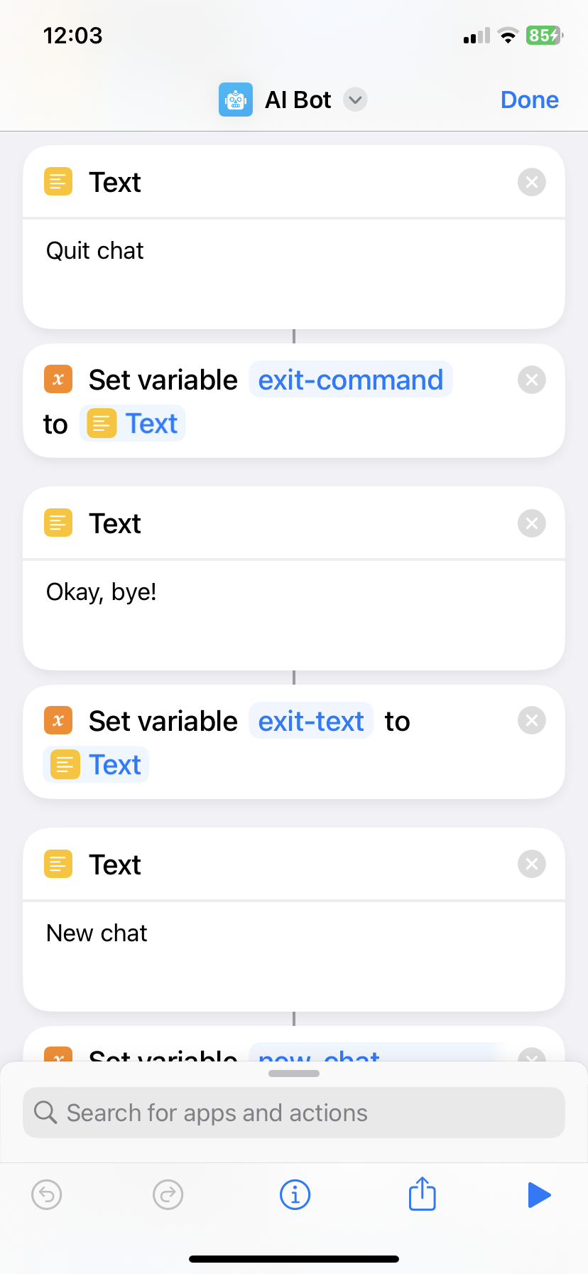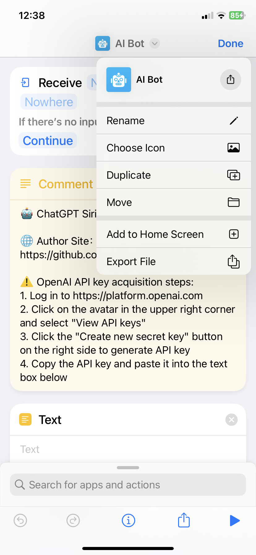 打开“快捷指令”应用,找到已下载的“ChatGPT”快捷指令,长按选择“编辑”,并将上述API密钥粘贴到下方的文本框中。